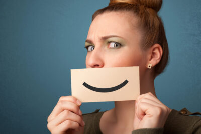 femme avec une etiquette devant la bouche avec un sourire dessus